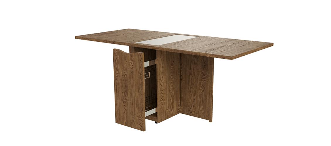 SM 101 er et multifunksjonelt spisebord som tydelig viser Skovbys filosofi om funksjonell design. Bordet har to oppfellbare klaffer – når begge er løftet opp, kan bordet romme fra tre til seks personer.