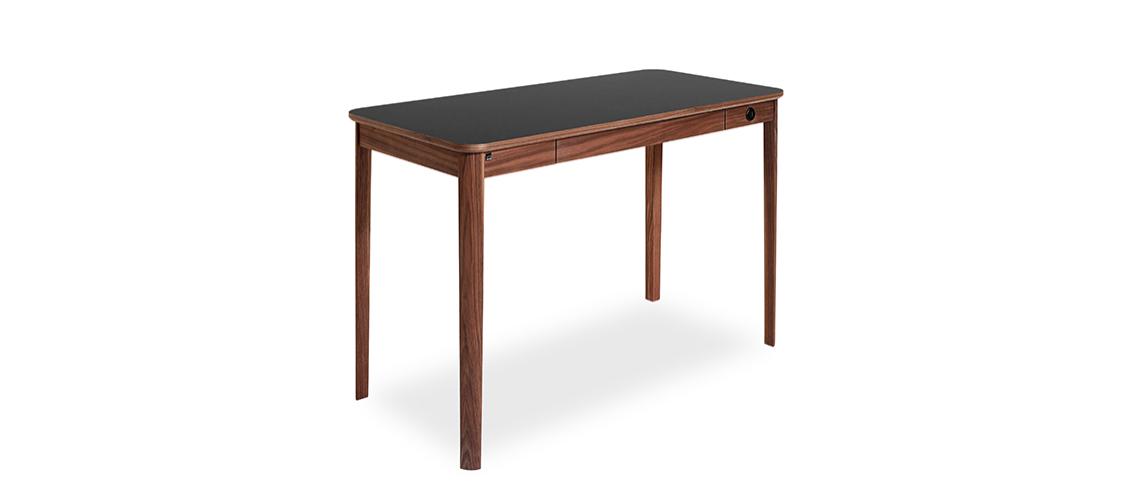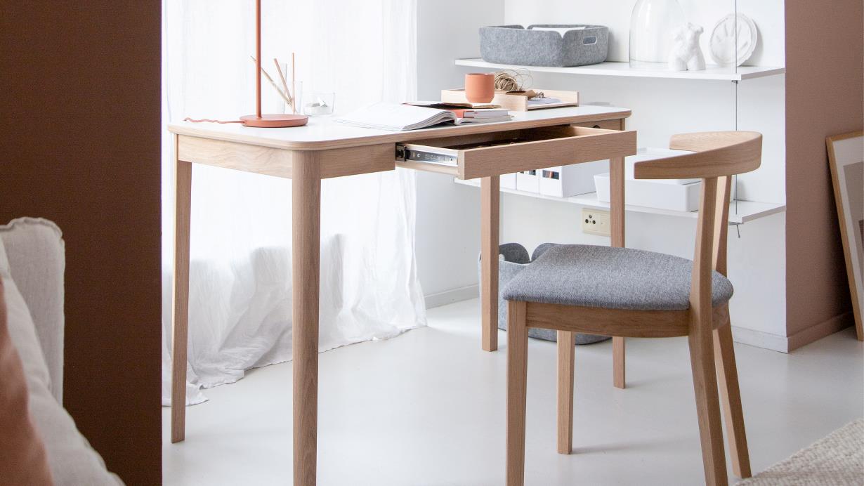 Det nye hjemmekontorbordet SM 131 fra Skovby har avrundede hjørner og leveres i heltre, finér eller laminat – en vakker og funksjonell arbeidsplass for moderne hjem.