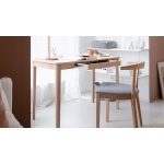 Bordet har et klassisk understell med fire treben plassert i hvert hjørne. Designet kombinerer enkelhet og eleganse med praktiske løsninger for hverdagen.