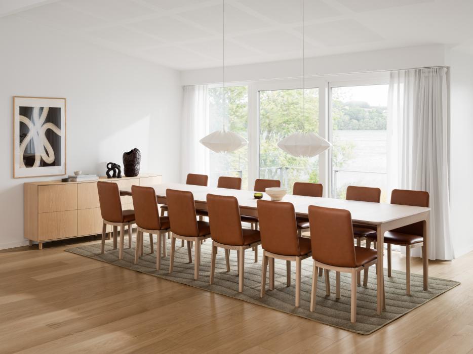 Den tidløse og slitesterke basen i massivt tre støtter det lubne setet, som er dekket med tykt skum for ultimat komfort. Stolens treramme og fyldige sete er avrundet og gir stolen et mykt uttrykk i både form og følelse.