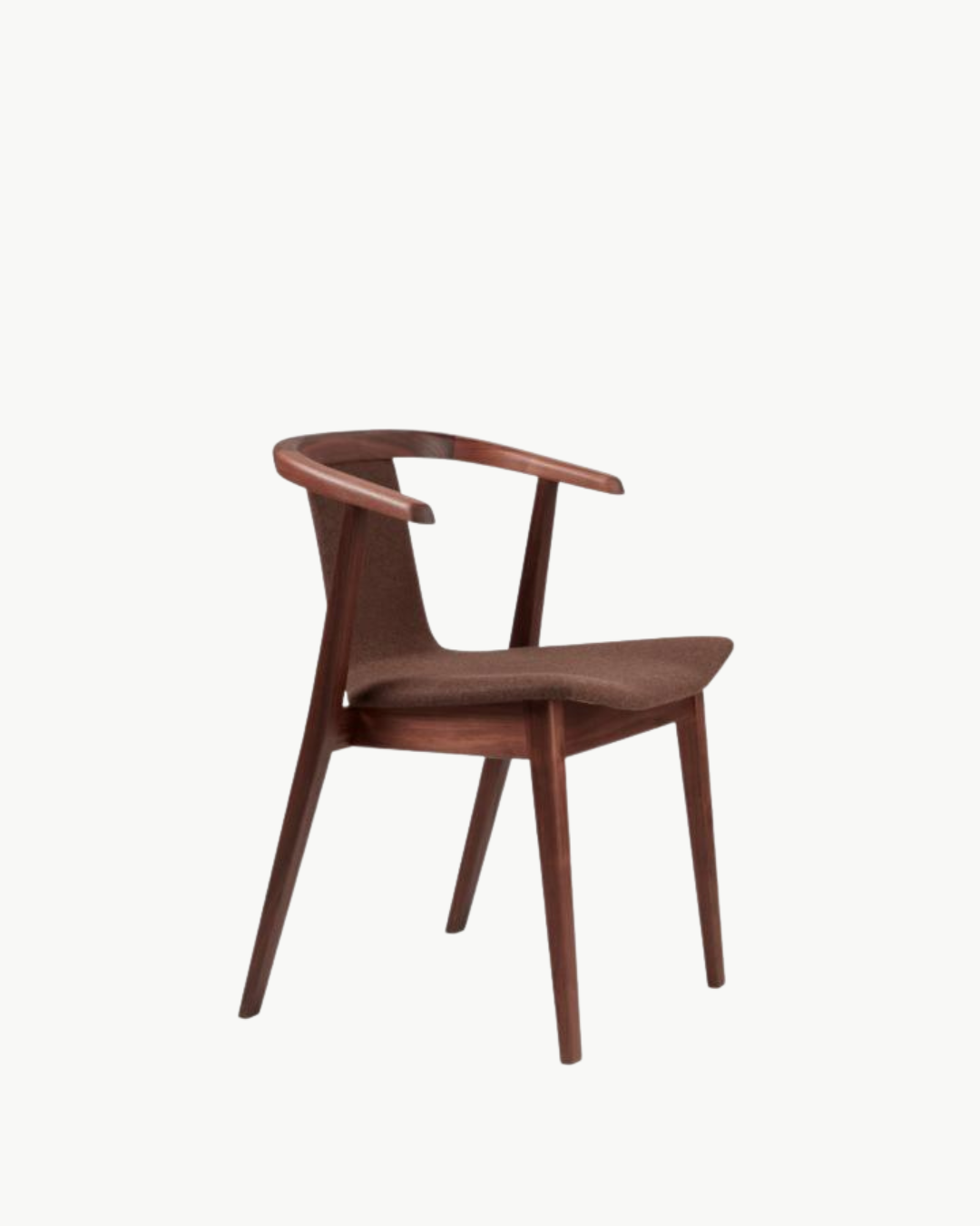 Kombinasjonen av ryggstø i pressformet finer, rammeverk i heltre og polstret rygg gir en stol som både er solid og visuelt tiltalende.
