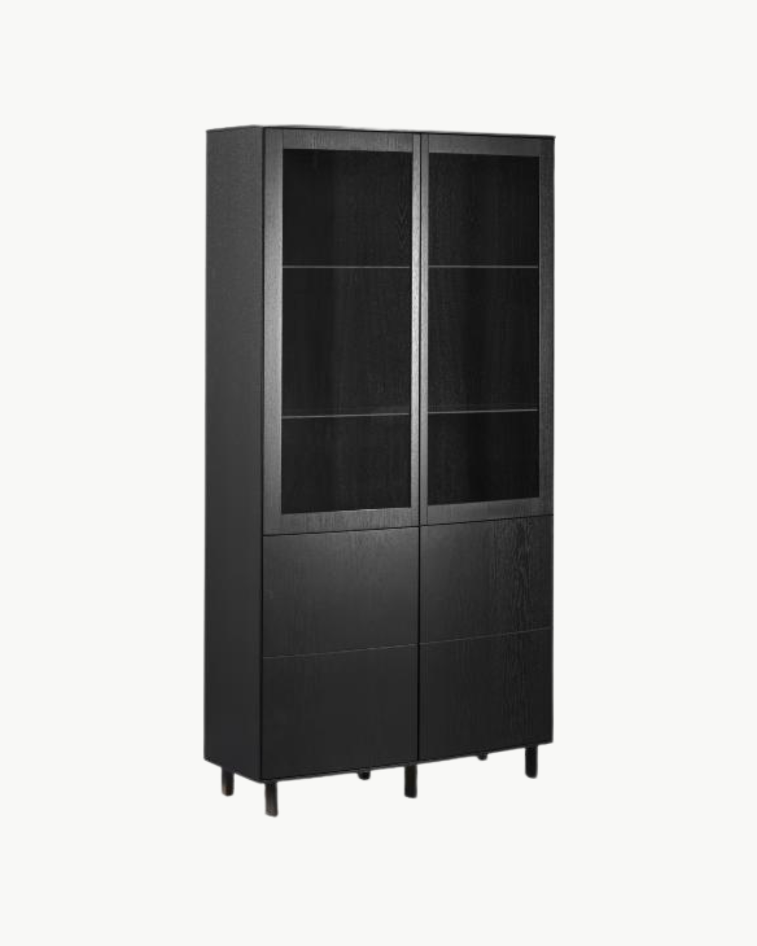 Skapet står på seks slanke, trapesformede ben i heltre, som gir både god stabilitet og et lett, svevende uttrykk.