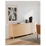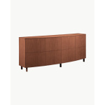 Skjenken står på seks slanke, trapesformede ben i heltre, som sørger for god stabilitet og et lett og luftig visuelt uttrykk.
