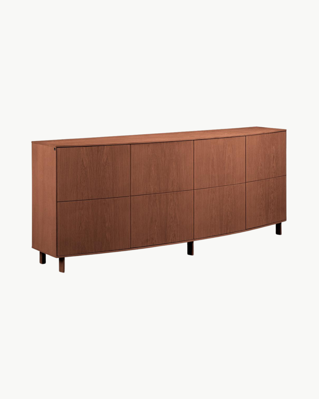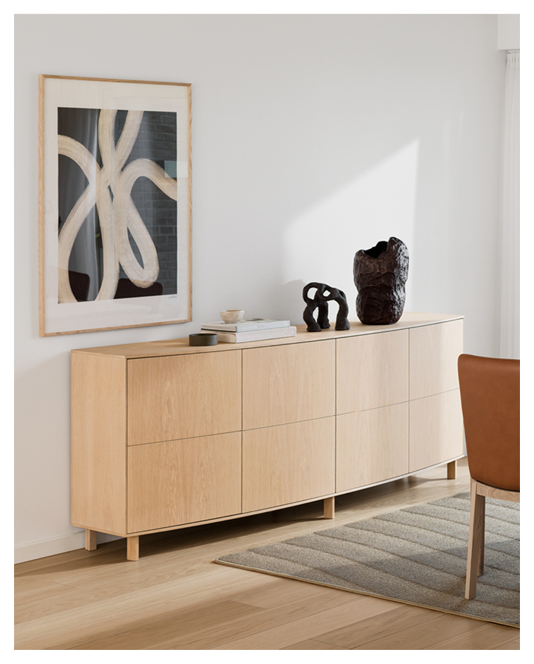 SM 414 er den største skjenken i vår elegante Curve-serie. Fronten består av formpressede finérdører med en lett buet form som skaper et rolig og balansert uttrykk – en kombinasjon av enkelhet og tidløs eleganse.