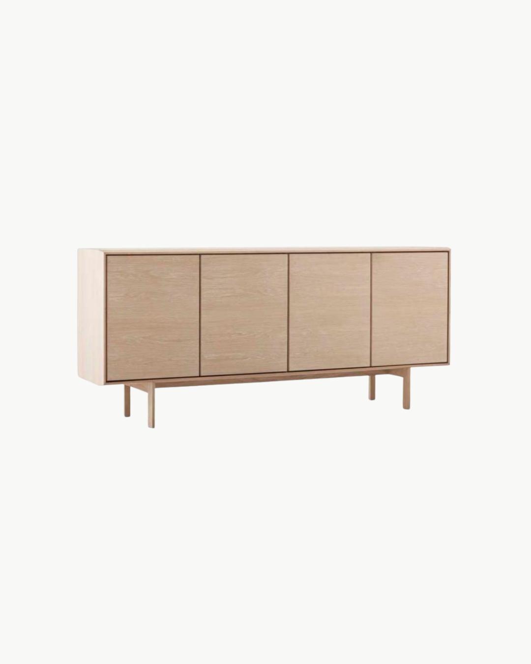 Skjenken står på seks slanke, trapesformede ben i heltre, som gir både god stabilitet og et lett, luftig preg.