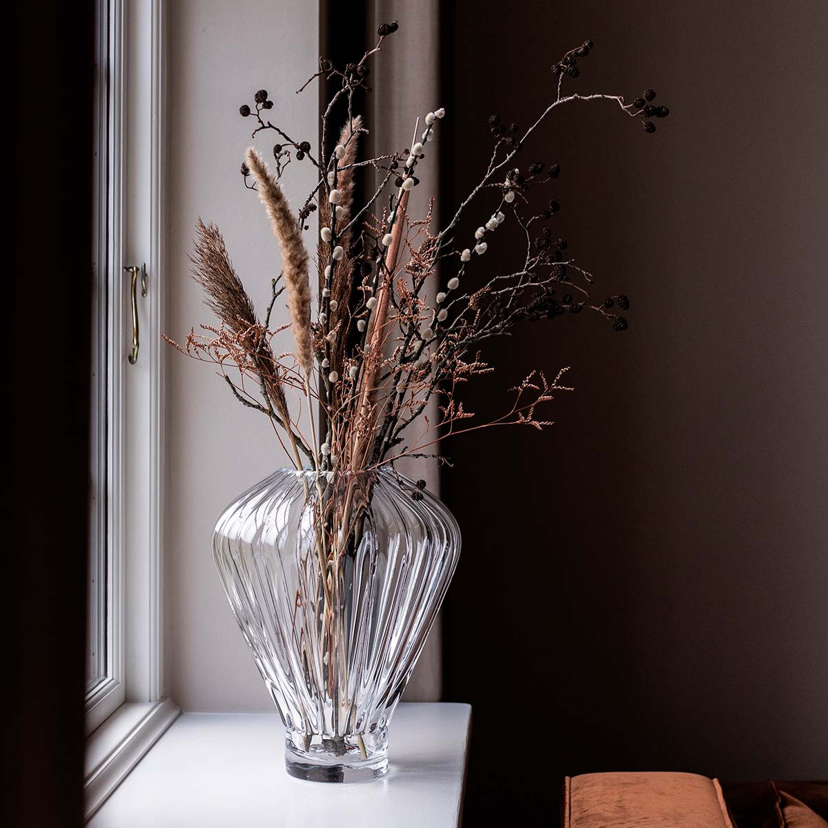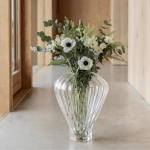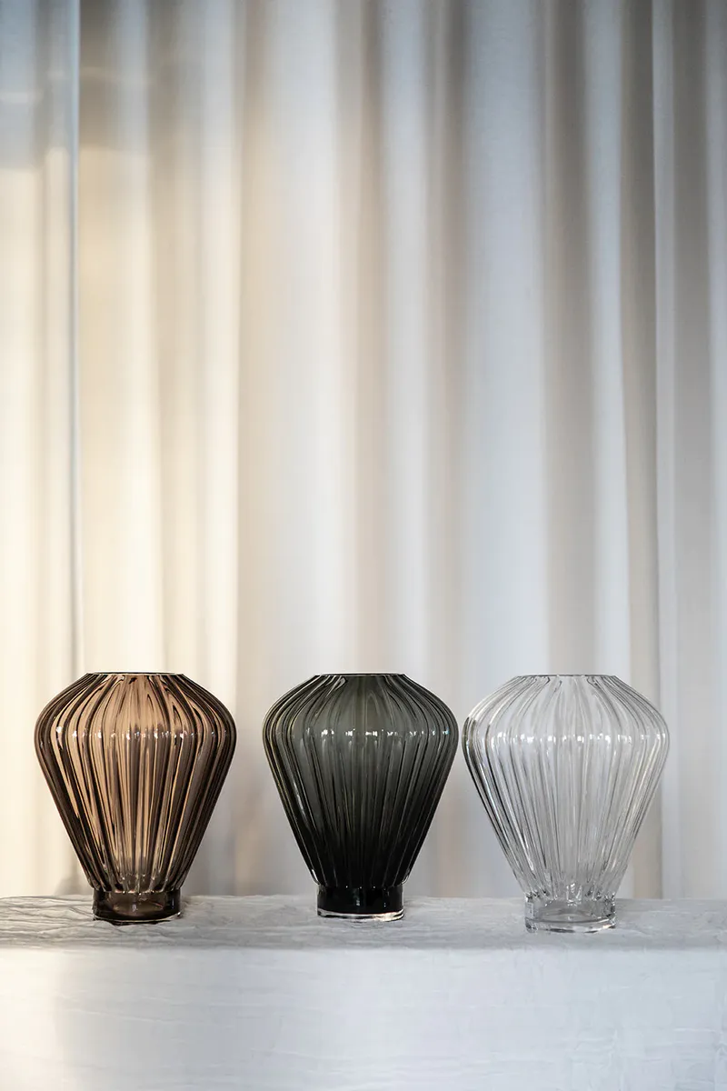 Med sitt geometriske formspråk og moderne mønster er Evelyn Vase designet for å være et sentralt designelement i hjemmet hele året – uavhengig av blomstertrender og årstider. Evelyn Vase er produsert i Europa og er munnblåst. Munnblåsingsteknikken er et gammelt og rikt håndverk, som har gått videre i generasjoner. Vi jobber veldig tett med produksjonen vår for å kombinere våre moderne design med deres tradisjonelle ferdigheter. Vi omfavner den unike produksjonsprosessen og egenskapene til denne spesielle produksjonen – dette betyr at hvert produkt er unikt. Luftbobler og andre ufullkommenheter kan oppstå som et resultat av produksjonen, som vi elsker og setter pris på.