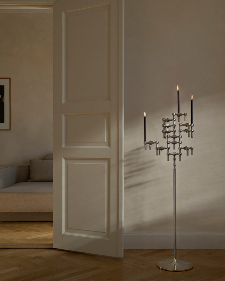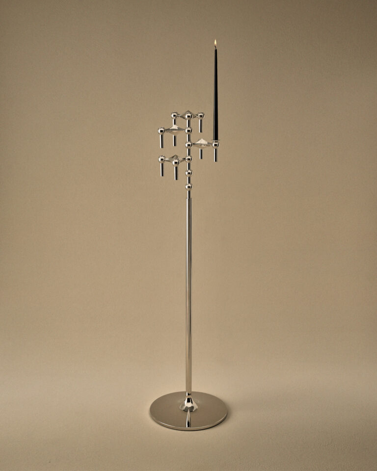 STOFF Nagel-gulvstativet er et gjenopplivet design fra 1960-tallet, omtenksomt gjeninnført for å forbedre lysestaken. Ved å løfte lysestaken fra flate overflater, forvandler gulvstativet den til en skulpturell gulvutstilling. Gulvstativet er designet for å sømløst utfylle alle lysestakutgavene i STOFF Nagel-kolleksjonen, og lar lysestaken stilles ut hvor som helst i rommet med eleganse.