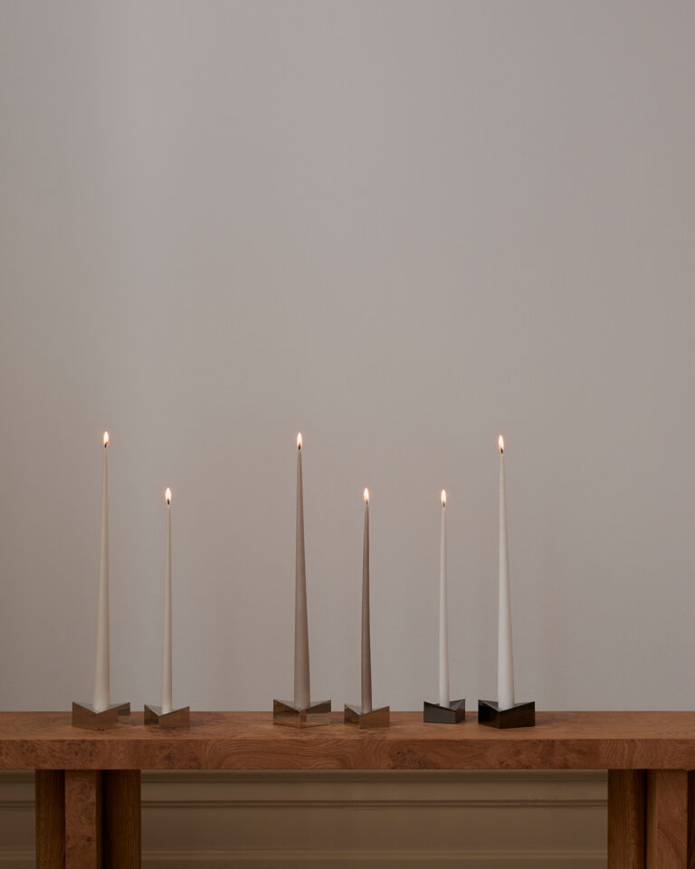 De eksklusive, håndfargede STOFF Nagel-lysestakene fra danske Ester & Erik har en lang og konisk form med en kjegleformet bunn som gjør at de passer perfekt i de store Reflect-lysestakene fra STOFF Nagel.