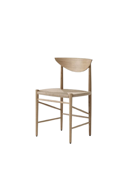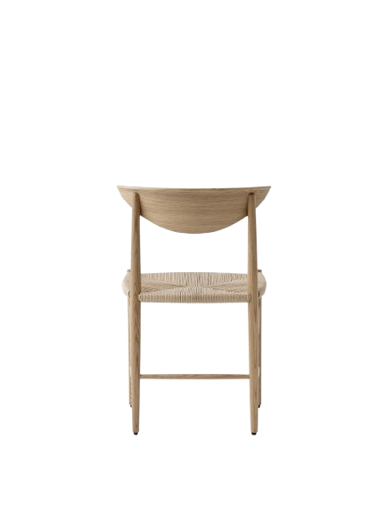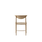 Laget av dreid og frest heltre med formpresset ryggstøtte. Setet er håndvevd av mer enn 100 meter naturlig papirsnor.