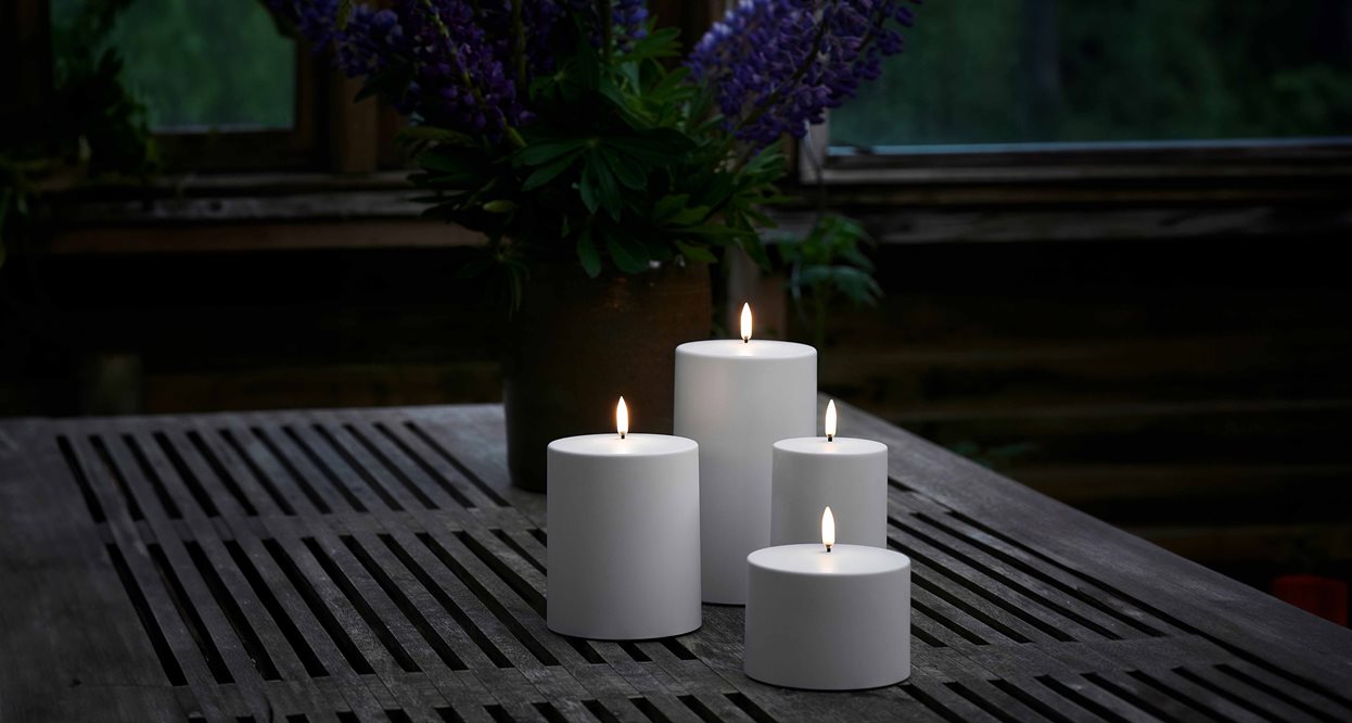 Lysenes lett flimrende og patenterte 3D-flamme i kombinasjon med den parafinbehandlede overflaten gjør LED-lysene virkelighetstro og inngir samme myke og innbydende følelse i rommet som levende lys. Kombiner kronelysene med Uyunis fjernkontroll med dimmerfunksjon som kan stilles inn på 4, 6, 8 eller 10 timer i stedet for lysets innebygde timer på 6 timer.