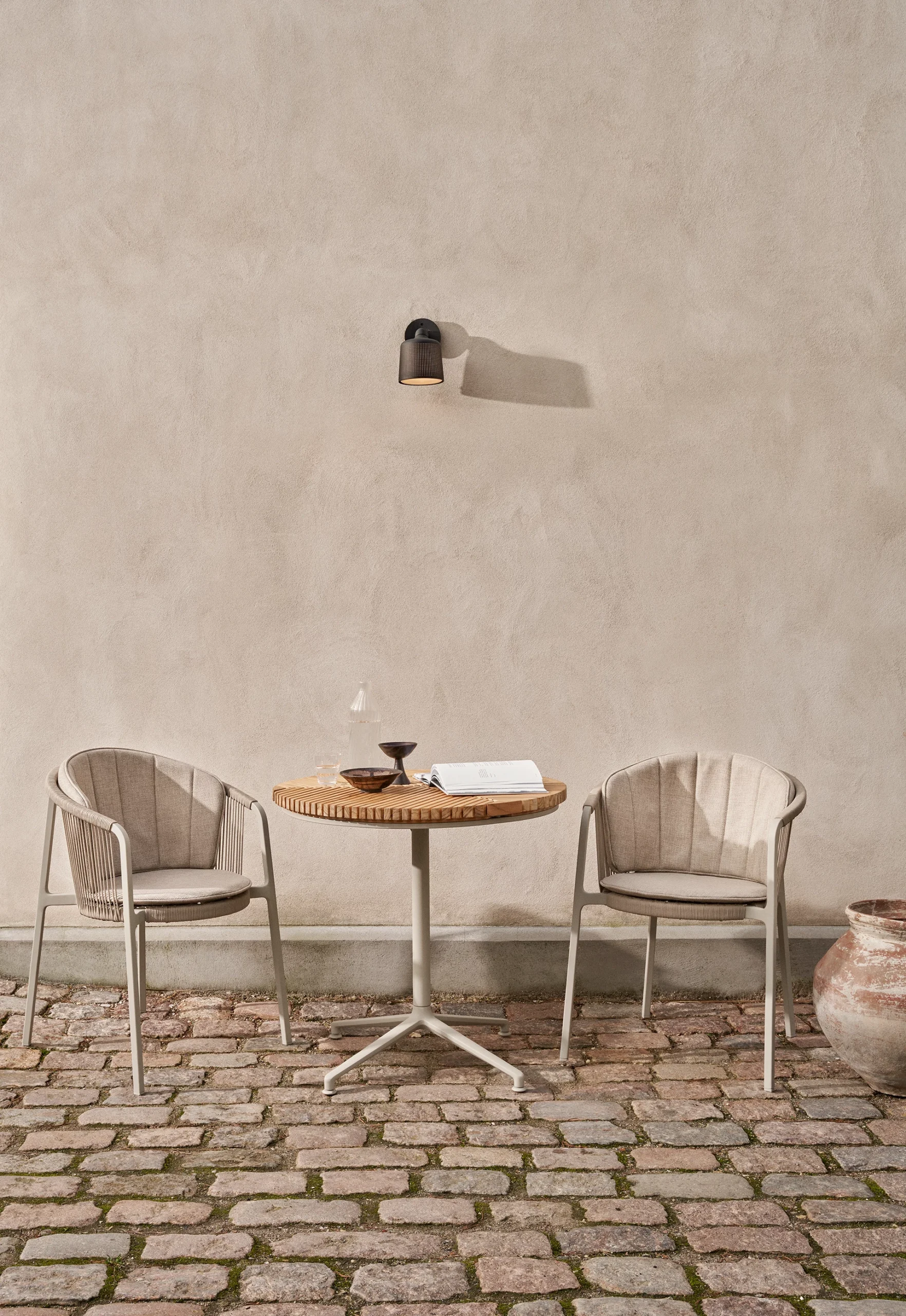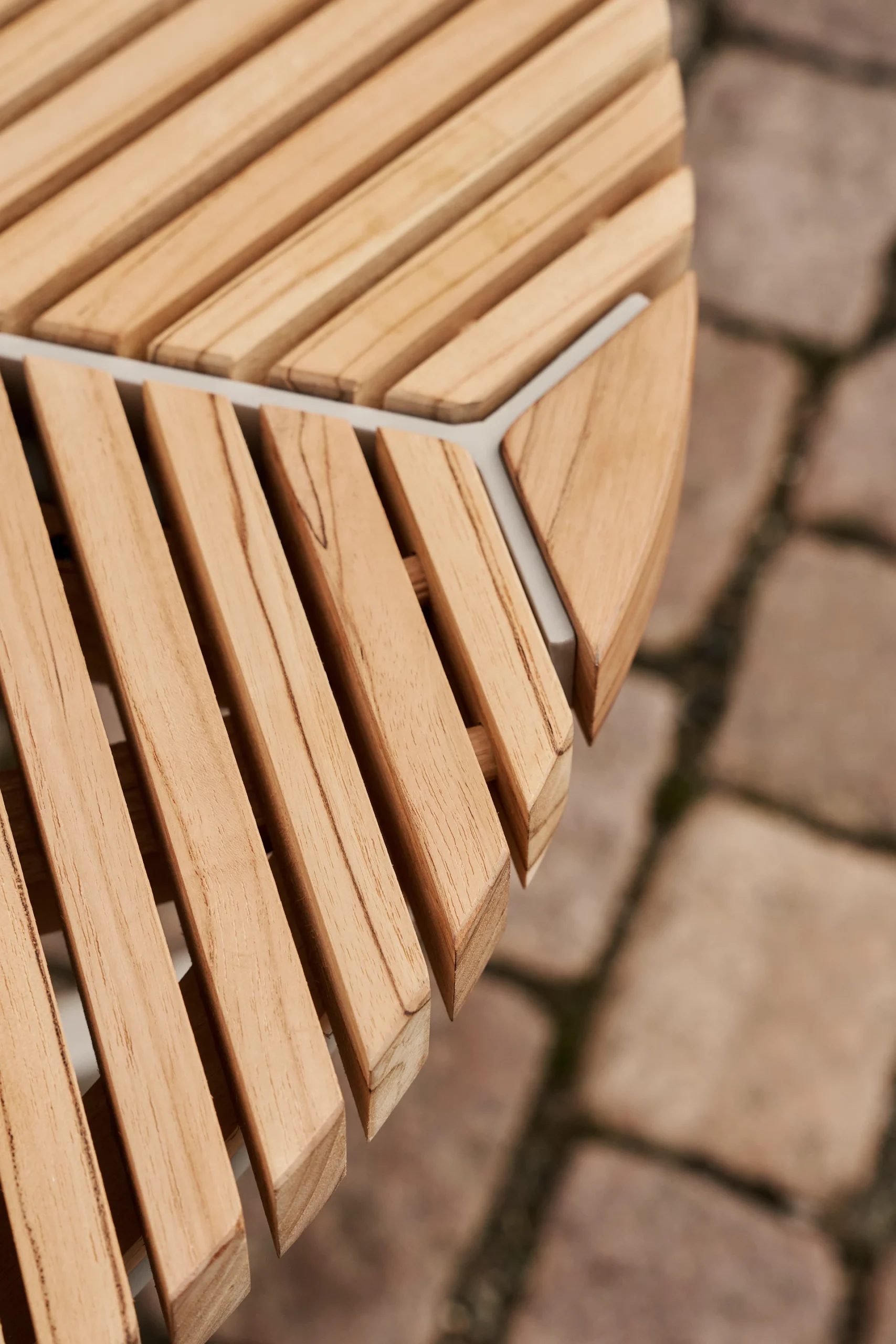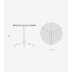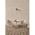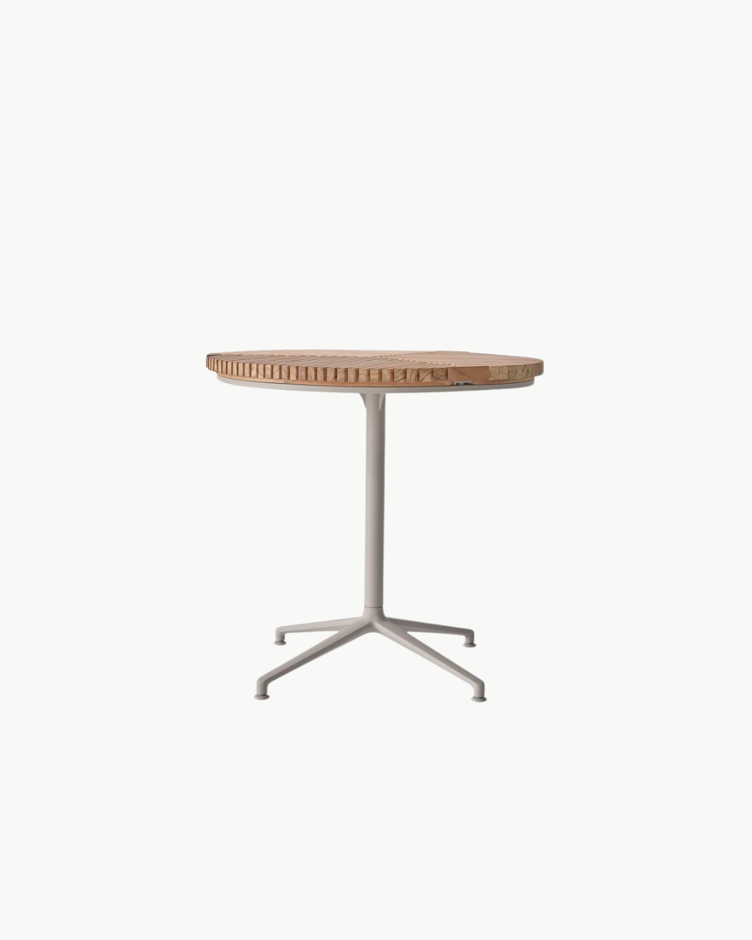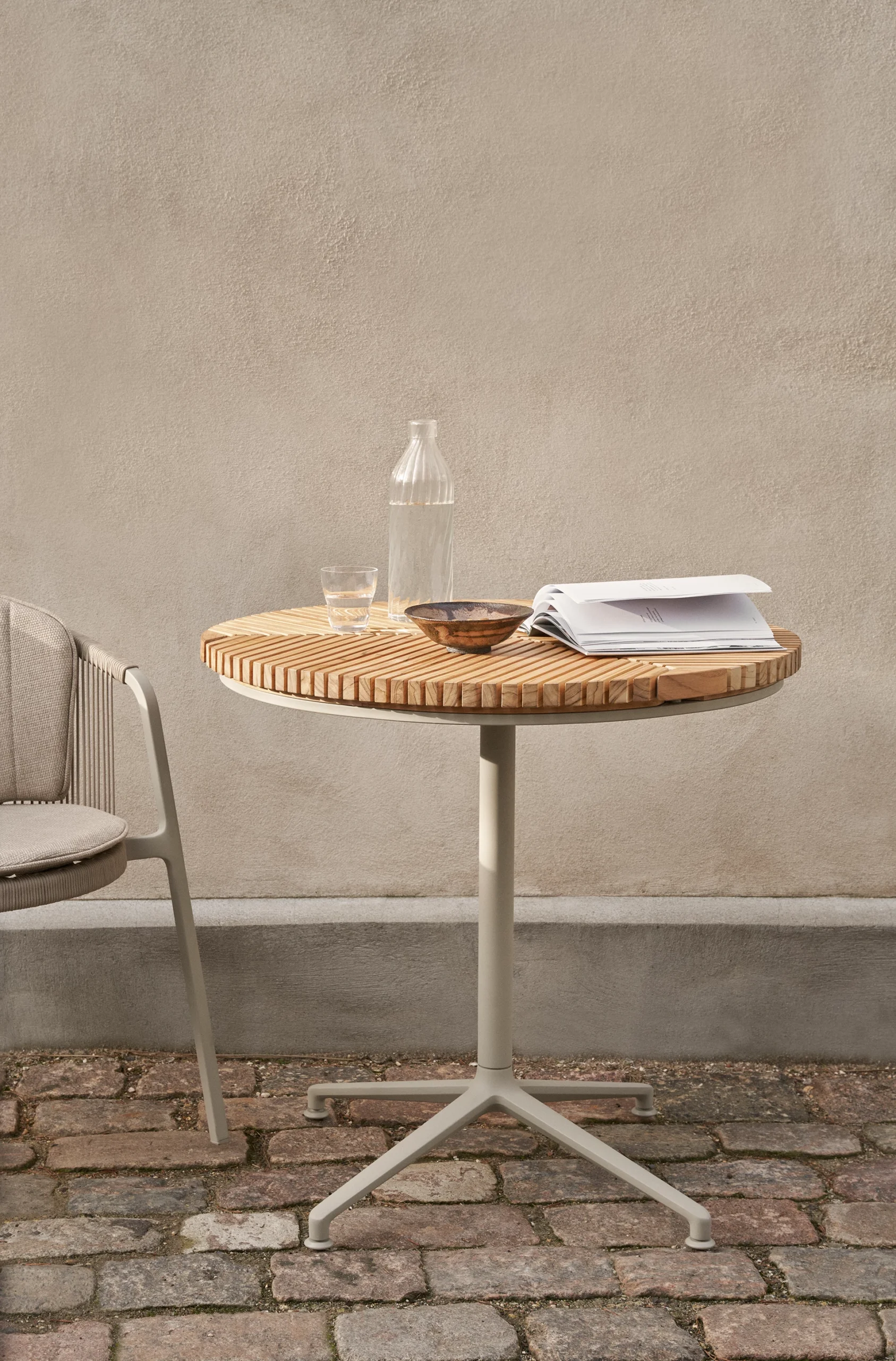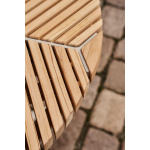 I likhet med borddesignet til Open-Air-sofabordet, gjentas slanke teaklameller i Open-Air-sofabordet. Bordet er plassert oppå en firbent base laget av pulverlakkert aluminium, og begge materialene er valgt for sin holdbarhet og motstand mot utendørsforhold.