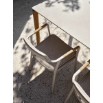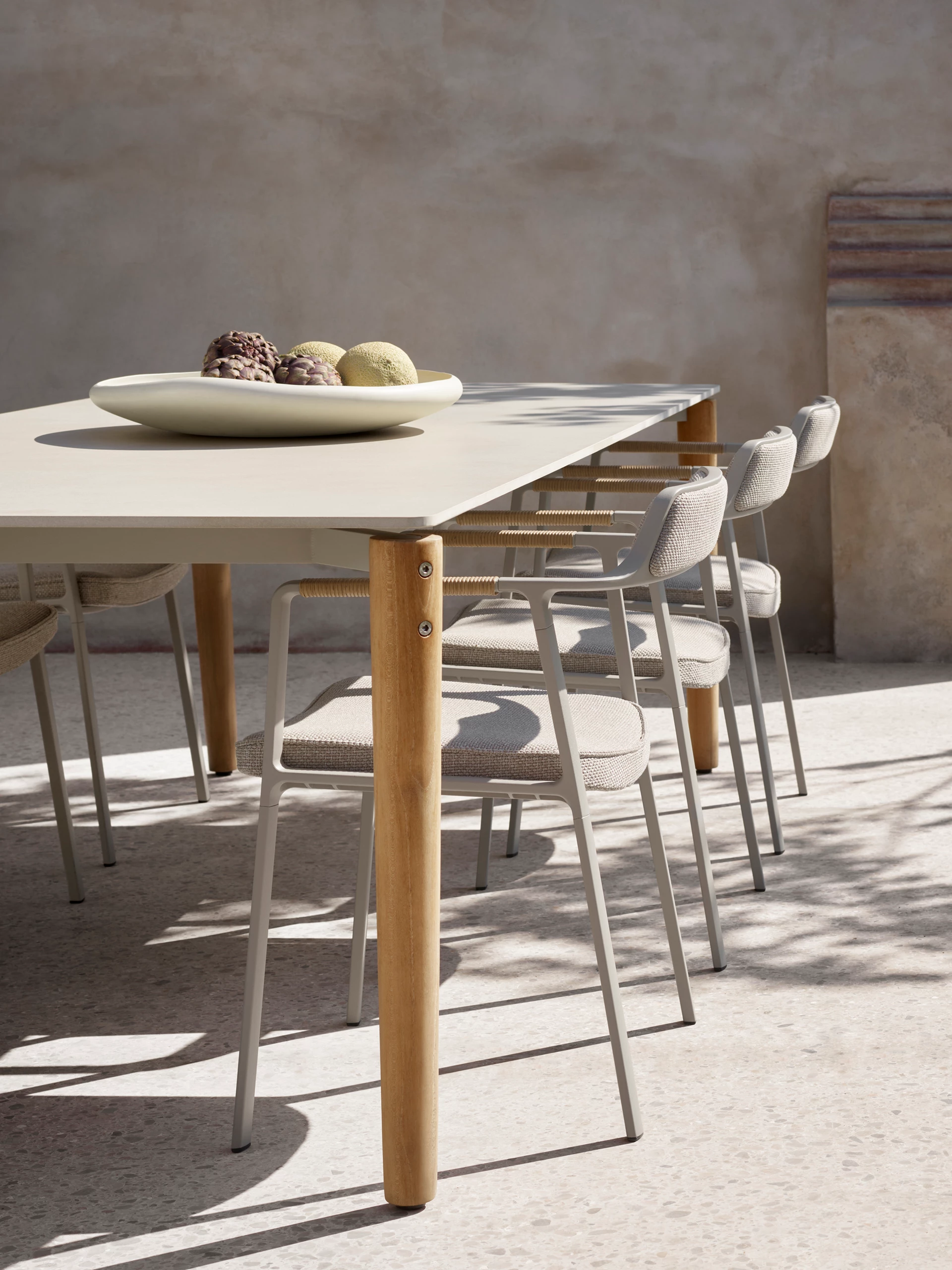 Utendørsbordet Open-Air kommer i to størrelser og består av en aluminiumsramme med en 12 mm keramisk bordplate. Bena er koniske og laget av teak. Små justerbare føtter finnes under hvert ben, slik at bordets høyde kan justeres avhengig av underlaget.