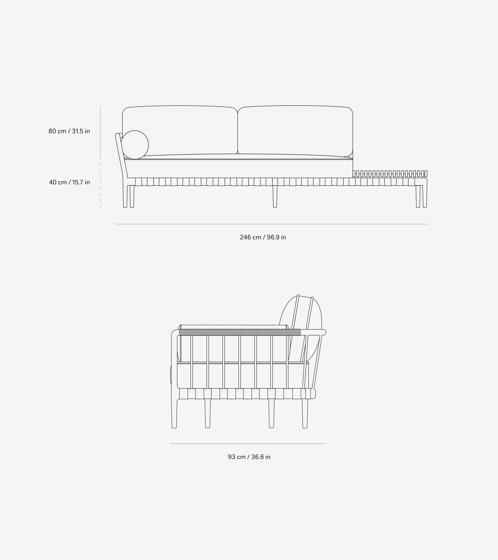 Mål: L x D x H: 246,0 x 93,0 x 80,0 cm | 96,9 x 36,6 x 31,5 tommer