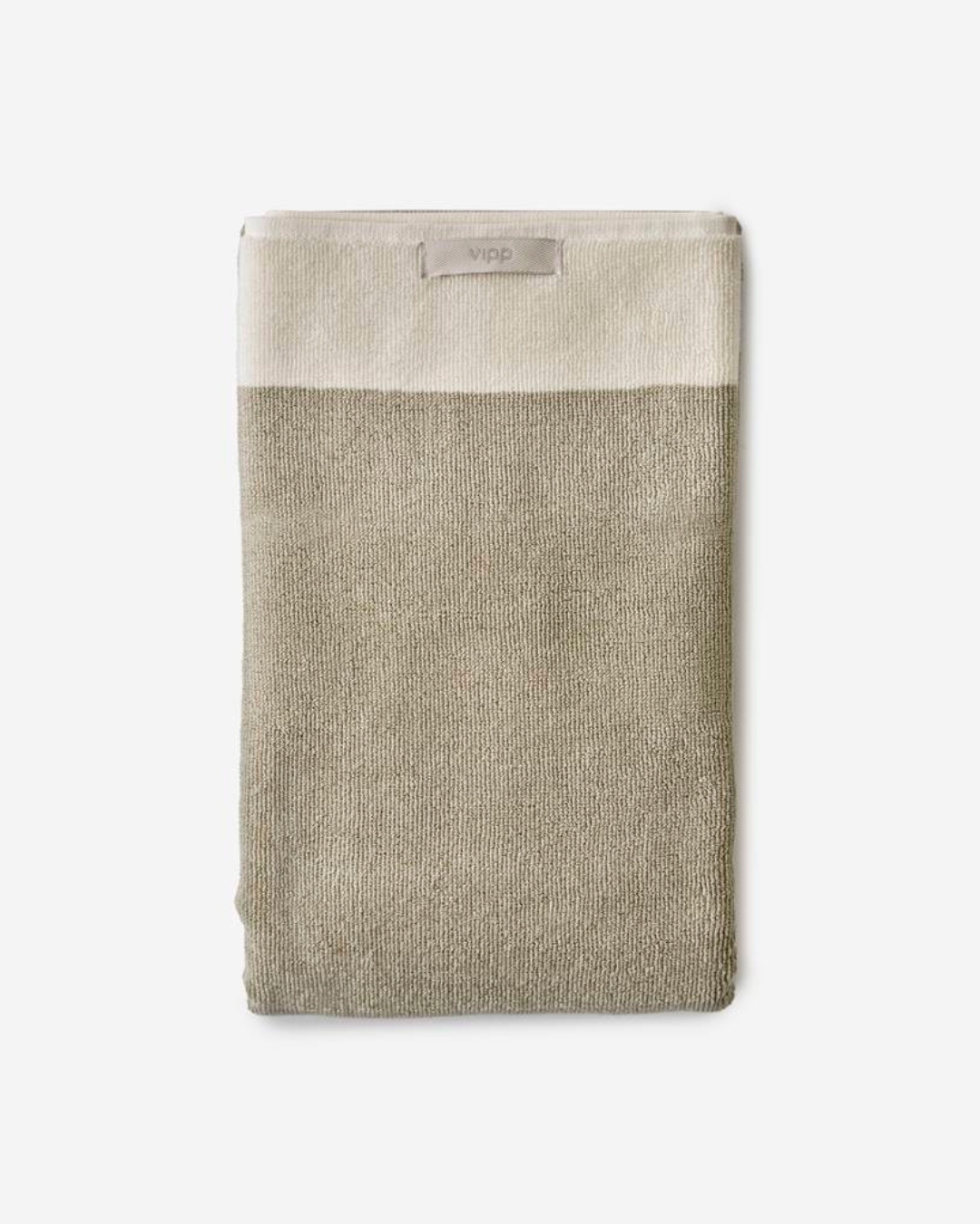 Vipp-håndklærne er vevd av en bomullsblanding og tilbyr førsteklasses kvalitet, absorberingsevne og mykhet. Håndklærne er designet i ensfarget farge med en kontrastfarget kant, og har en tekstilstropp.
