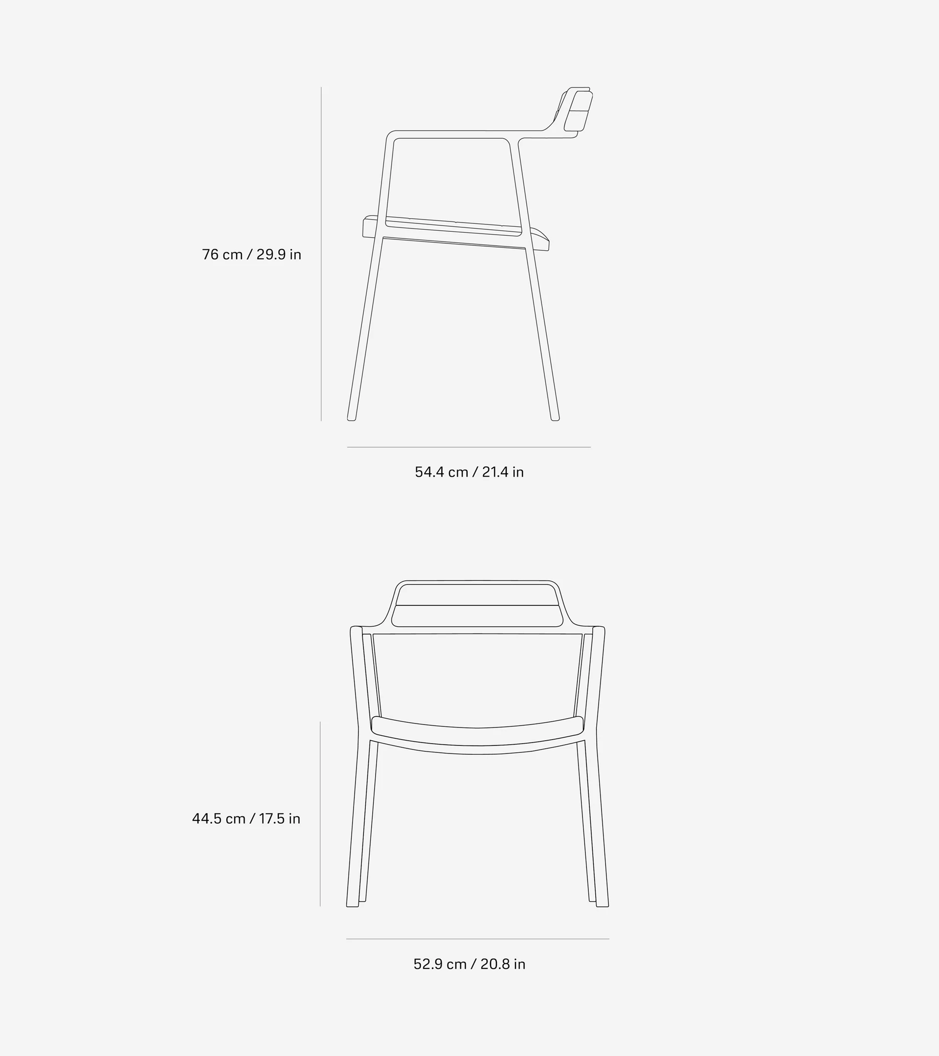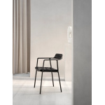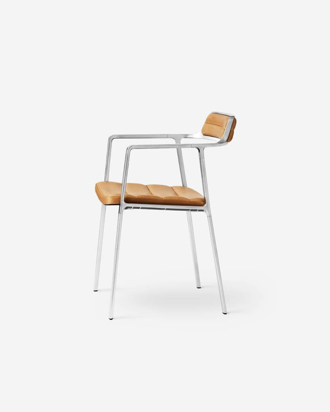 Vipp-stolen passer til spisestuen eller stuen, og er den første stolen som introduseres i Vipps møbelportefølje. Stolen har en pulverlakkert eller polert aluminiumsramme med avrundede armlener og en slank ryggstøtte. Trekket er tilgjengelig i enten svart eller sandfarget skinn med unike egenskaper.
