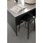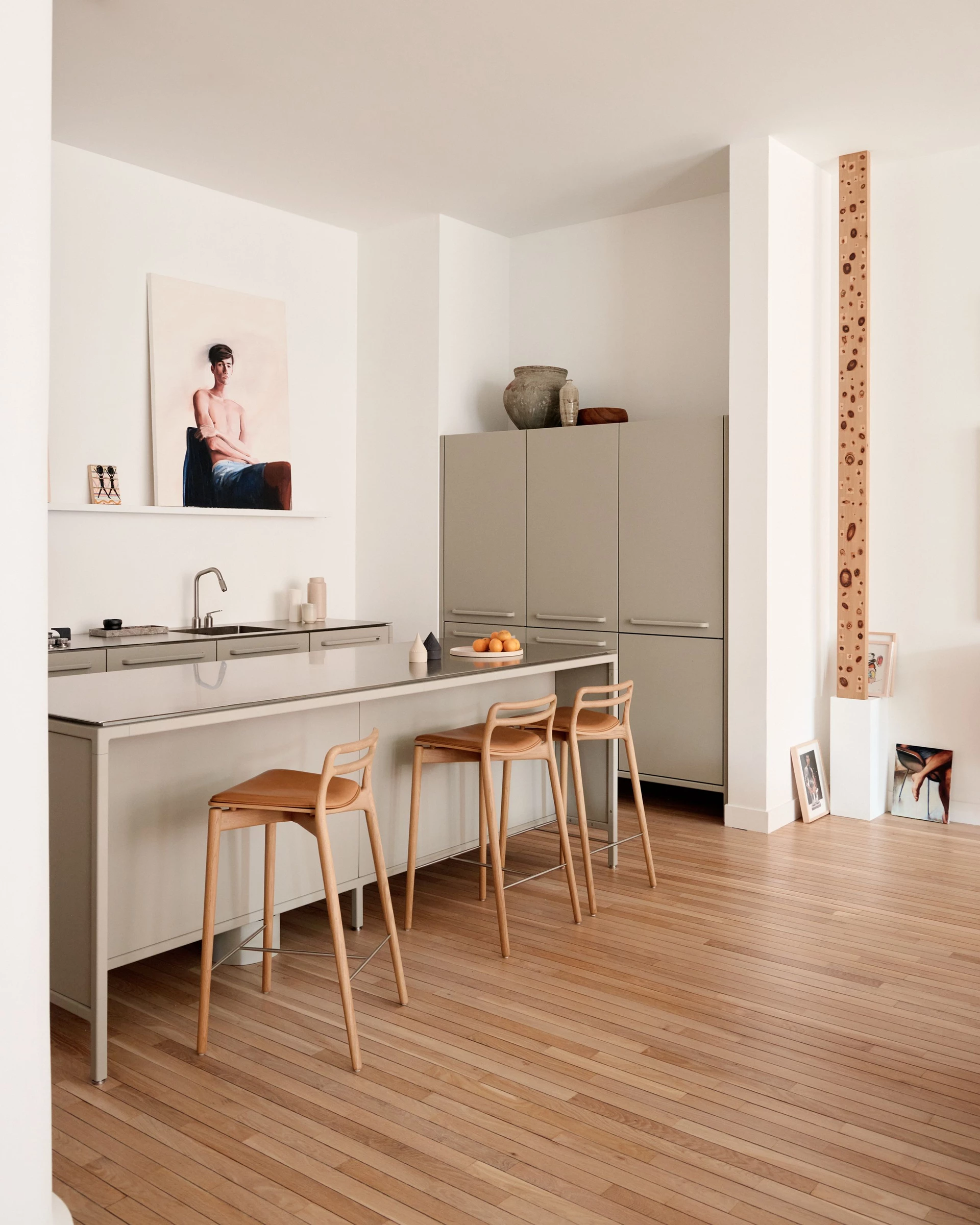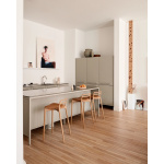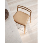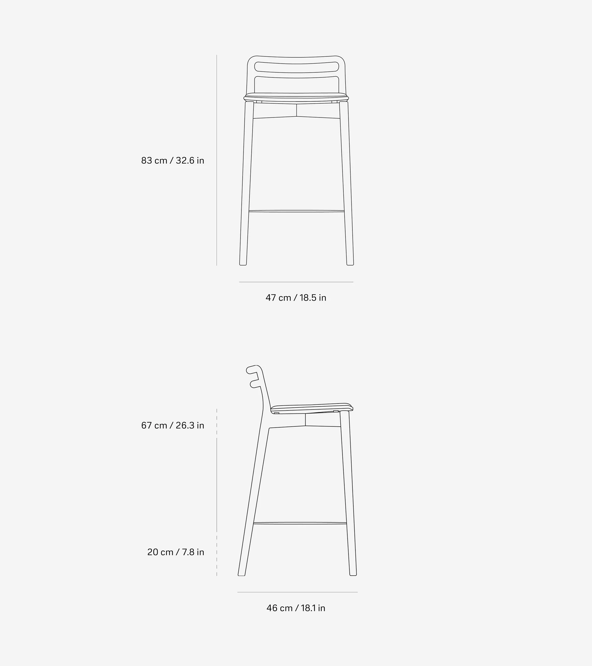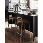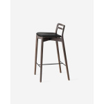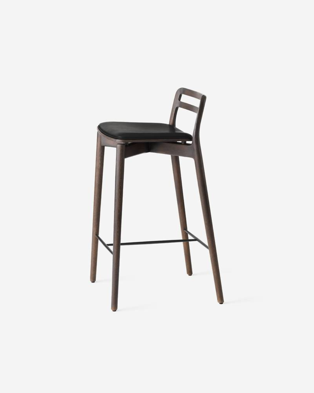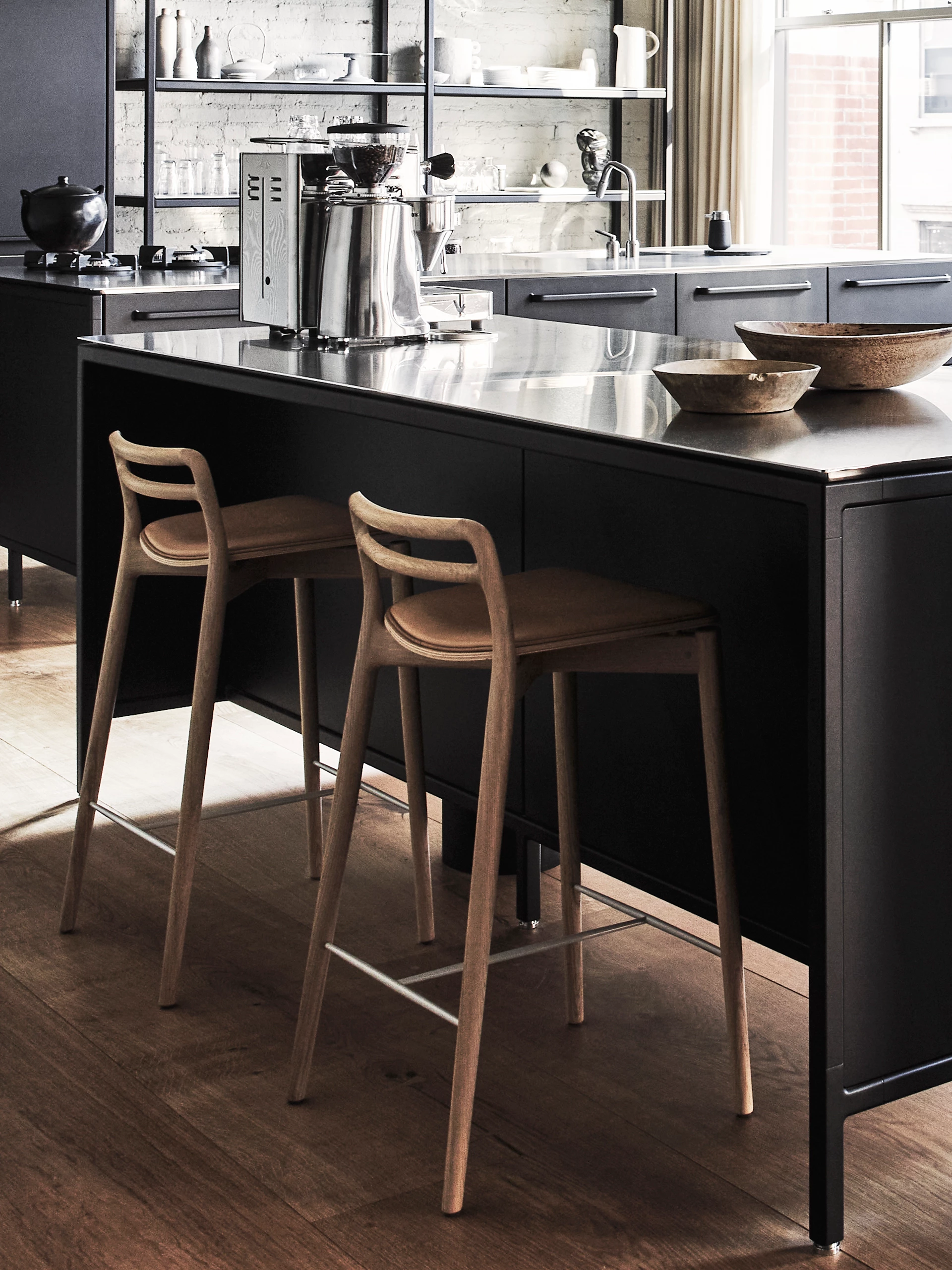 Vipp Cabin benkekrakk er laget for en kjøkkenbenk. Denne benkekrakken har avrundede komponenter i heltre eik og et svevende finersete med en påsatt pute i svart skinn. Den støttende fotstøtten i stål sikrer stabilitet.