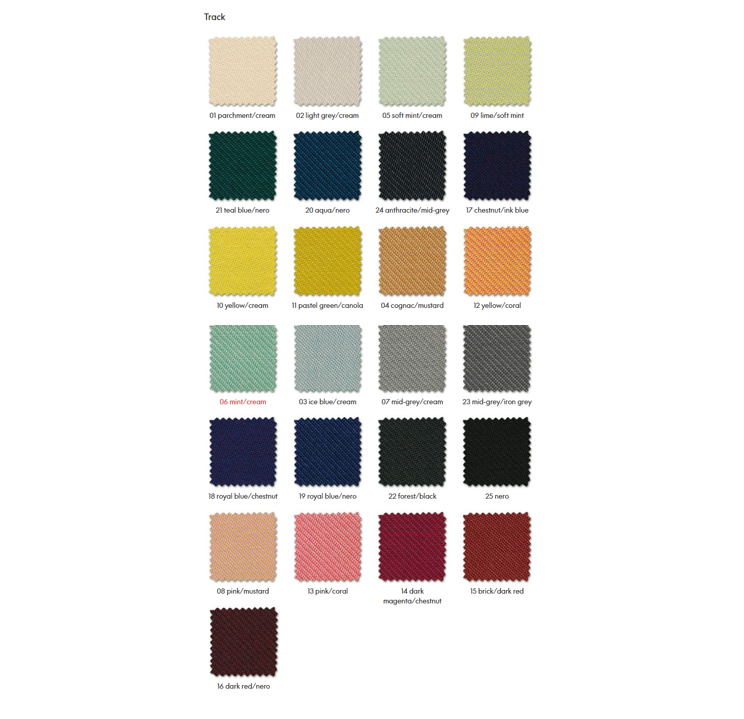 Dette produktet er i Track, Materiale: polyamid: 10 %, ny ull: 90 %, Slitestyrke: 100 000 Martindale. stativ er tilgjengelig i 25 farger.