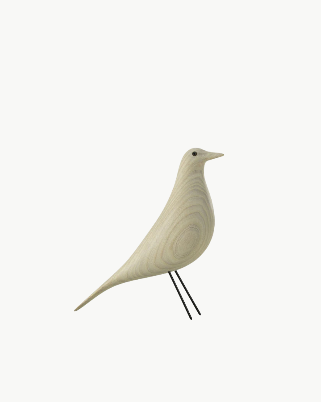 Eames House Bird er tilgjengelig i ask med svart eller hvit lakkfinish, samt i valnøtt. Alle versjoner er laget for å fremheve treets naturlige åring, noe som bidrar til figurens livlige sjarm.