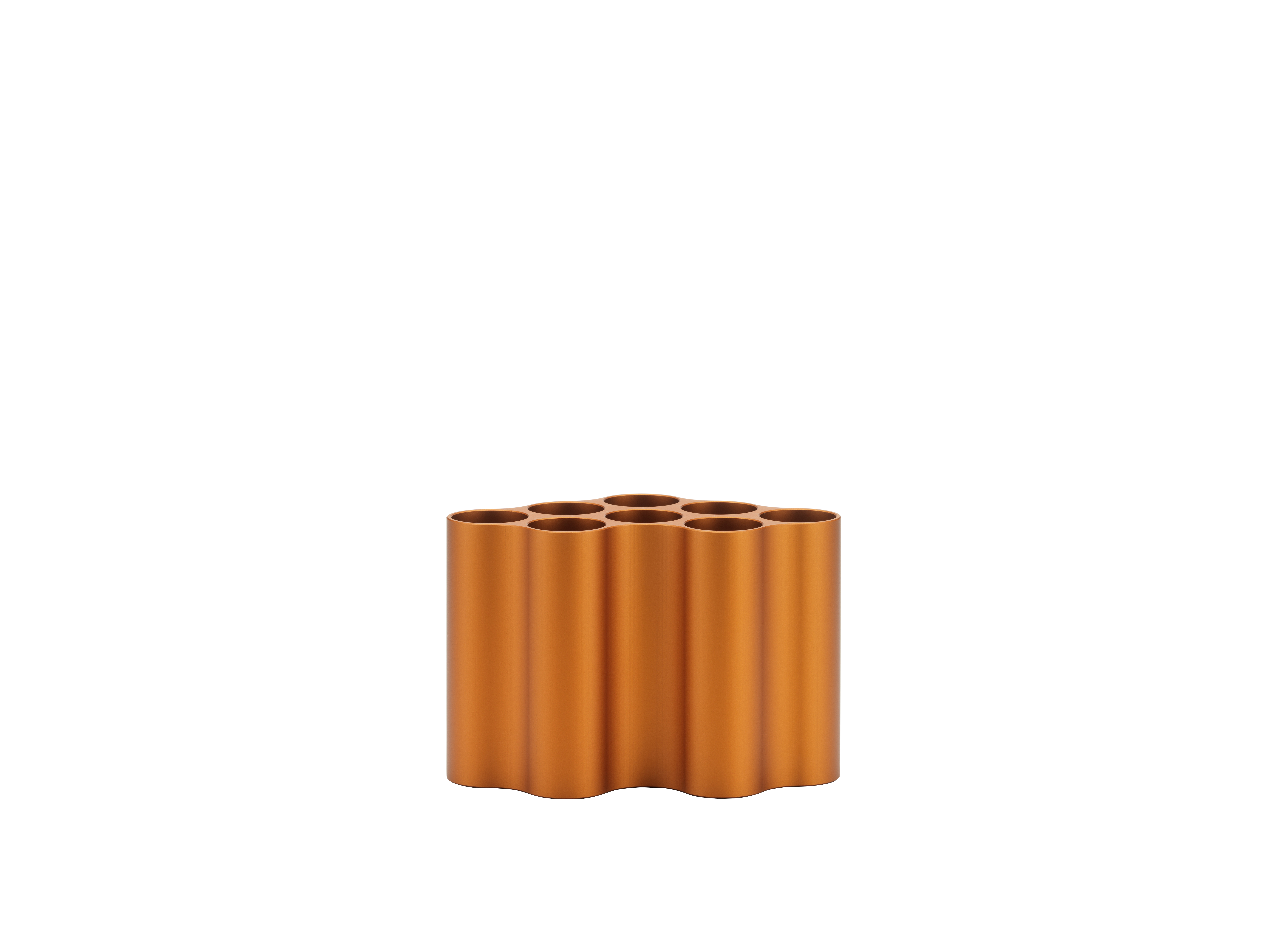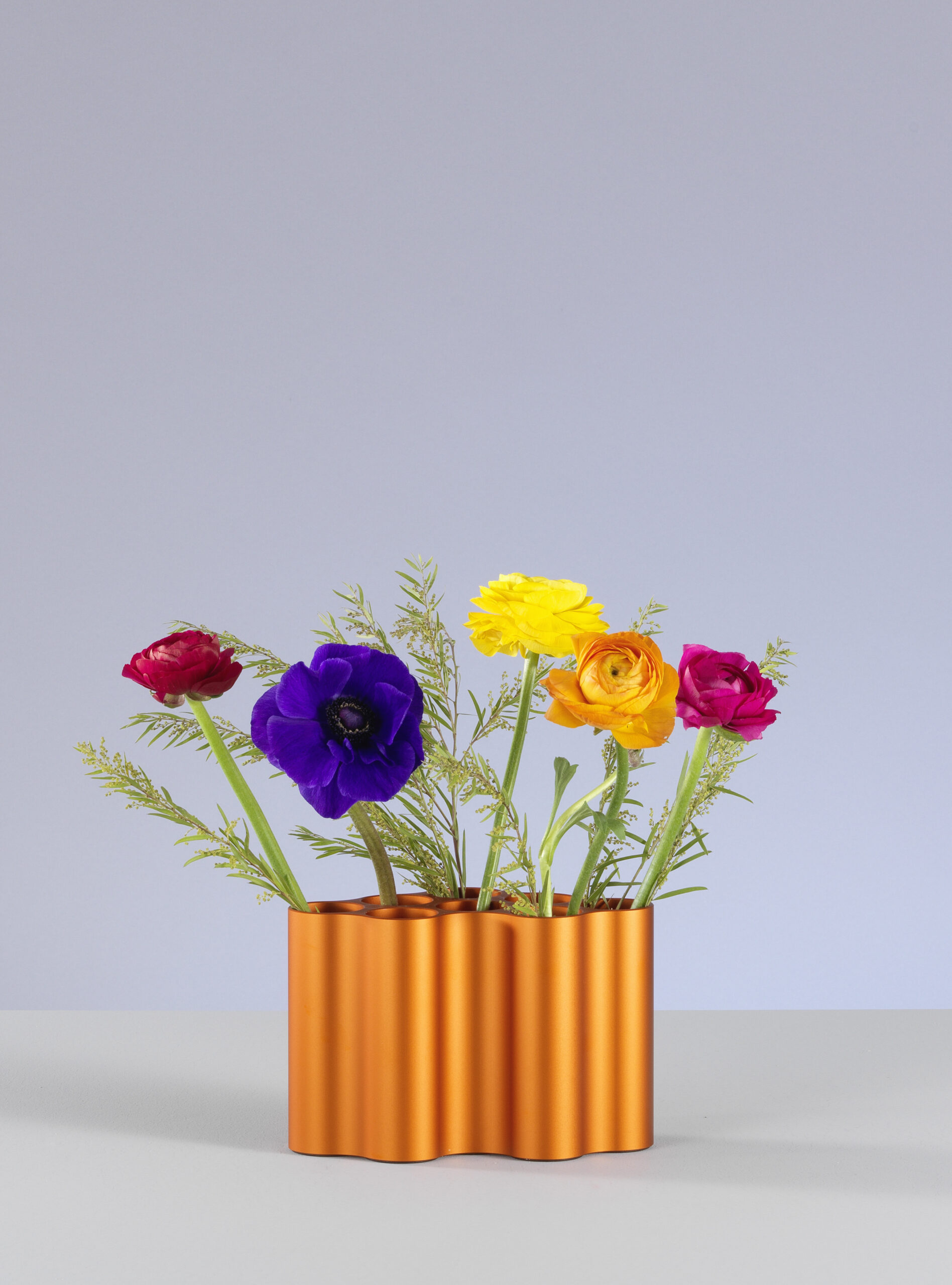 The shape of the Nuage vases made its first appearance in the oeuvre of Ronan and Erwan Bouroullec in 2002. Reminiscent of a cloud, it was originally produced as a plastic shelf module that can be grouped into clusters or large-scale configurations. Eight tubular cavities pierce the flat surfaces of the modular element while also defining the form’s outer contours. Over the years, the Bouroullec brothers have varied this shape and repeatedly incorporated it in their graphic work. For the Nuage vase, the designers executed the cloud motif in extruded aluminium profiles of varying lengths. The cavities in the basic form are now positioned upright, dividing the vase into eight individual tubes that can be used for the artful arrangement of flowers and grasses. The undulating surfaces, with an anodised finish in various colours, produce an attractive interplay of light and shadow. Thanks to their precise outer contours, the vases can be fitted together to create entire ‘cloud formations’. Material: anodised aluminium, rubber stoppers