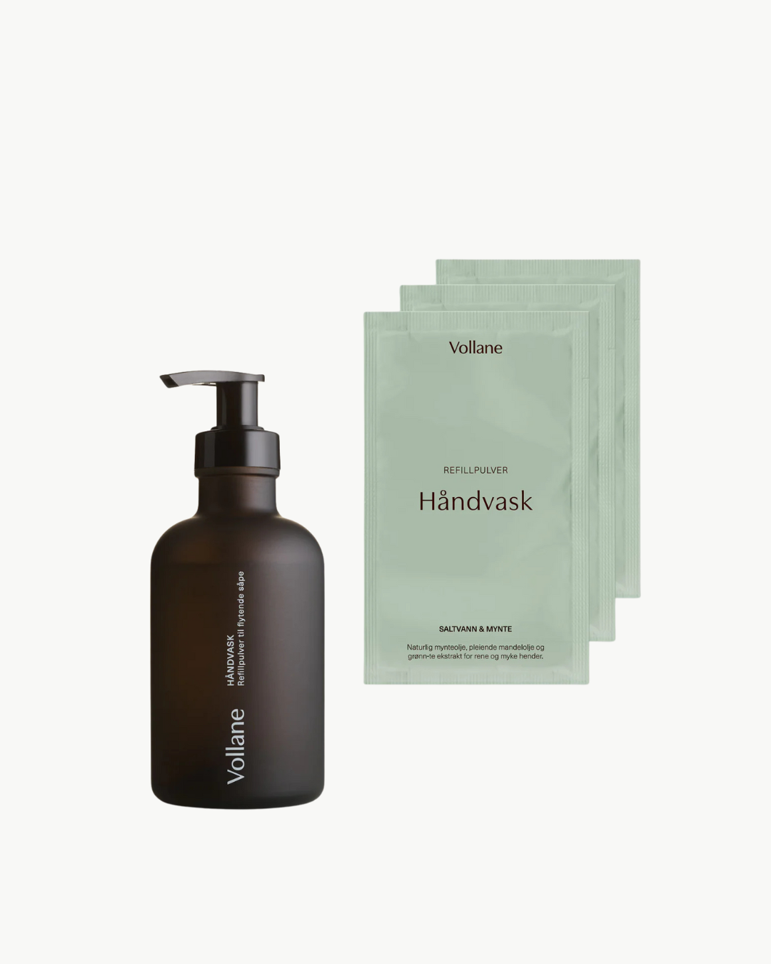 Vollanes første refillpulver kombinerer naturlig mynteolje, mandelolje og grønn te-ekstrakt for rene og myke hender. Såpen har en mild duft av saltvann og mynte, og en fyldig, vegansk, pH-hudnøytral og dermatologisk testet formel laget kun med trygge ingredienser.